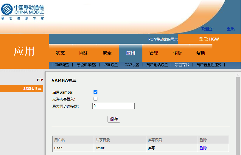 2、使用CMCCAdmin用户登录web页面,密码是aDm8H%MdA (或者),在家庭存储中打开samba与ftp功能;