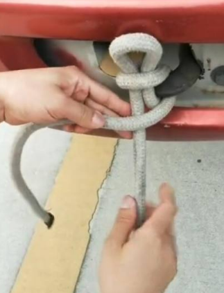 把底下右边的绳子从底下左边的绳子上转过去,然后把转过去的绳子再拉回来,将拉回来的绳子对折放到上面的绳圈中,拉进下面的绳子。