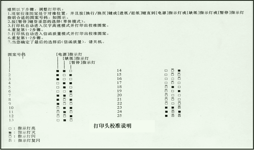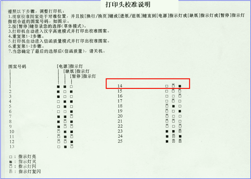 2.2.5 打印头校准:使用『换行/换页』键电源、缺纸、暂停指示灯调整成指导页所示的状态。例如:按NO.14图样进行校准,根据“打印头校准说明”,使用『换行/换页』键电源、缺纸、暂停指示灯调整成“亮闪灭”的状态。