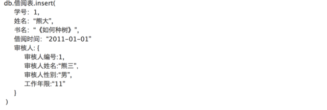 这样如果我们需要更新审核人个人信息的时候只需要更新审核人表而不需要对借阅人表做更新。而在NoSQL中除了这种规范化的外部数据表做法以外,我们还能用如下的非规范化方式把外部数据直接放到原数据集中,以提高查询效率。缺点也比较明显,更新审核人数据的时候将会比较麻烦。