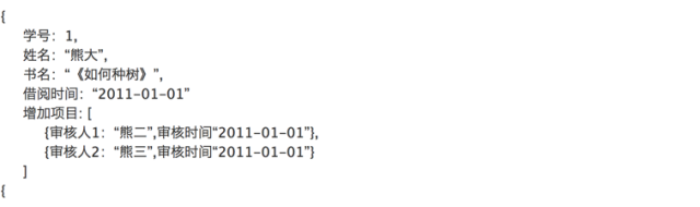 而NoSQL存储方式比较灵活,比如使用类JSON文件存储上表中熊大的借阅数据: