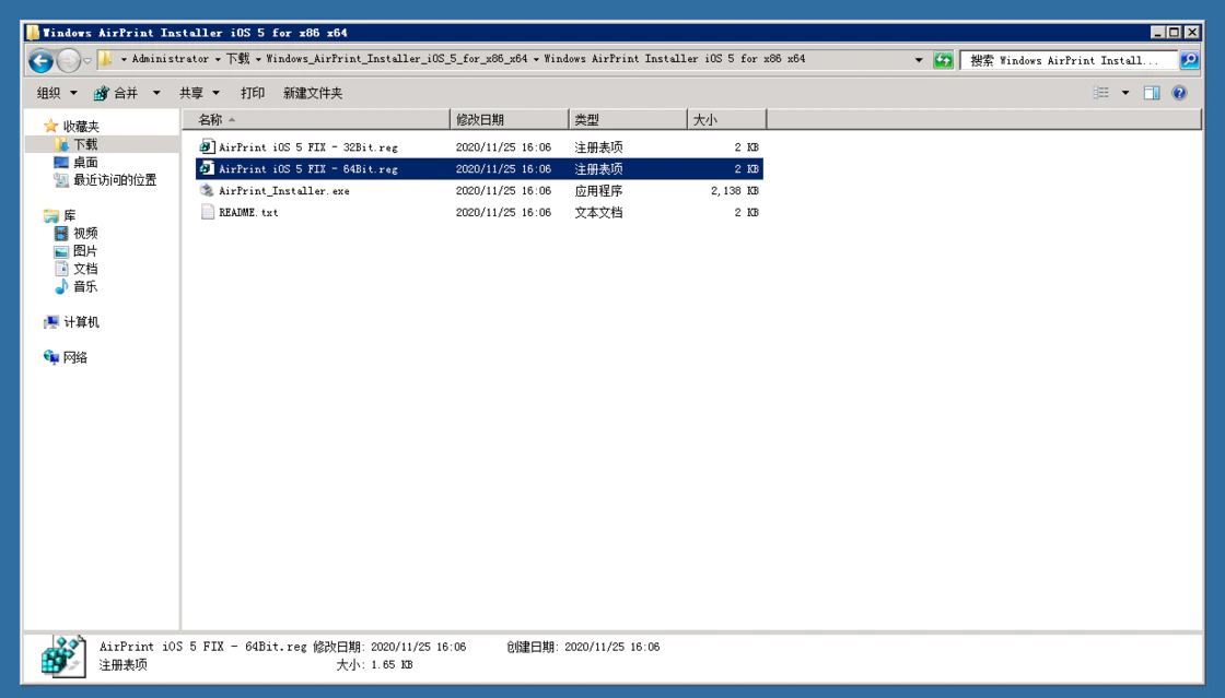 下面我们需要做的就是给这个 AirPrint for Windows 打上「补丁」:在前面解压缩的 AirPrint Installer 文件夹中找到 AirPrint iOS 5 FIX 对应的两个注册表文件,根据系统是 32 位还是 64位选择对应的版本并执行注册。