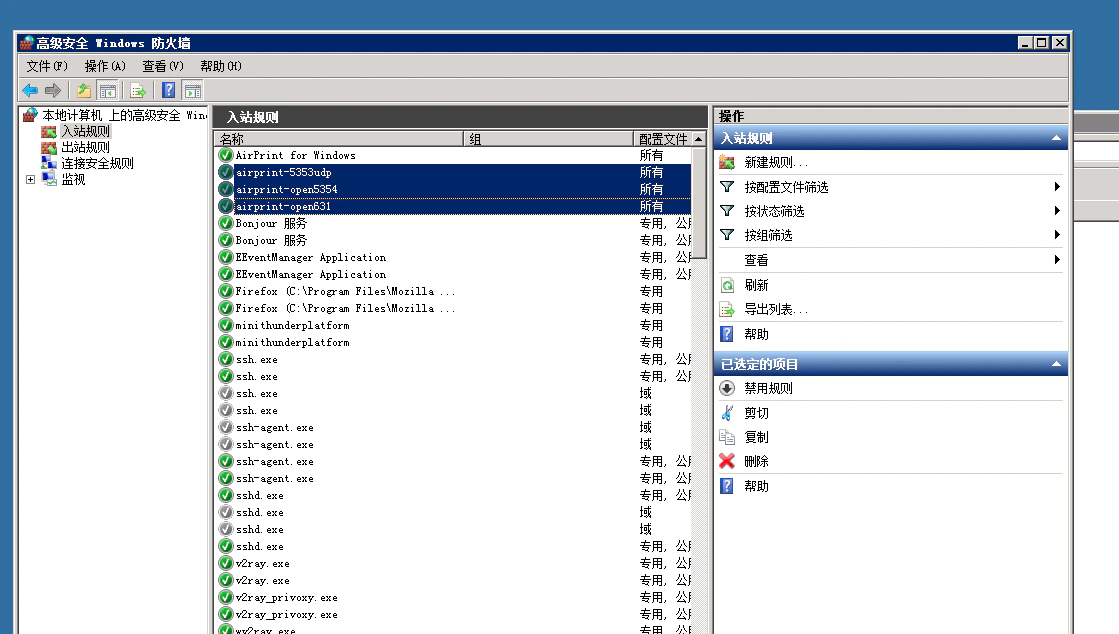 同样的办法我们需要设置三条规则,除了上面的 TCP 5354 端口之外,还需要放行 UDP 5353 端口以及 TCP 631 端口,这样防火墙方面算是全部设定完毕了。