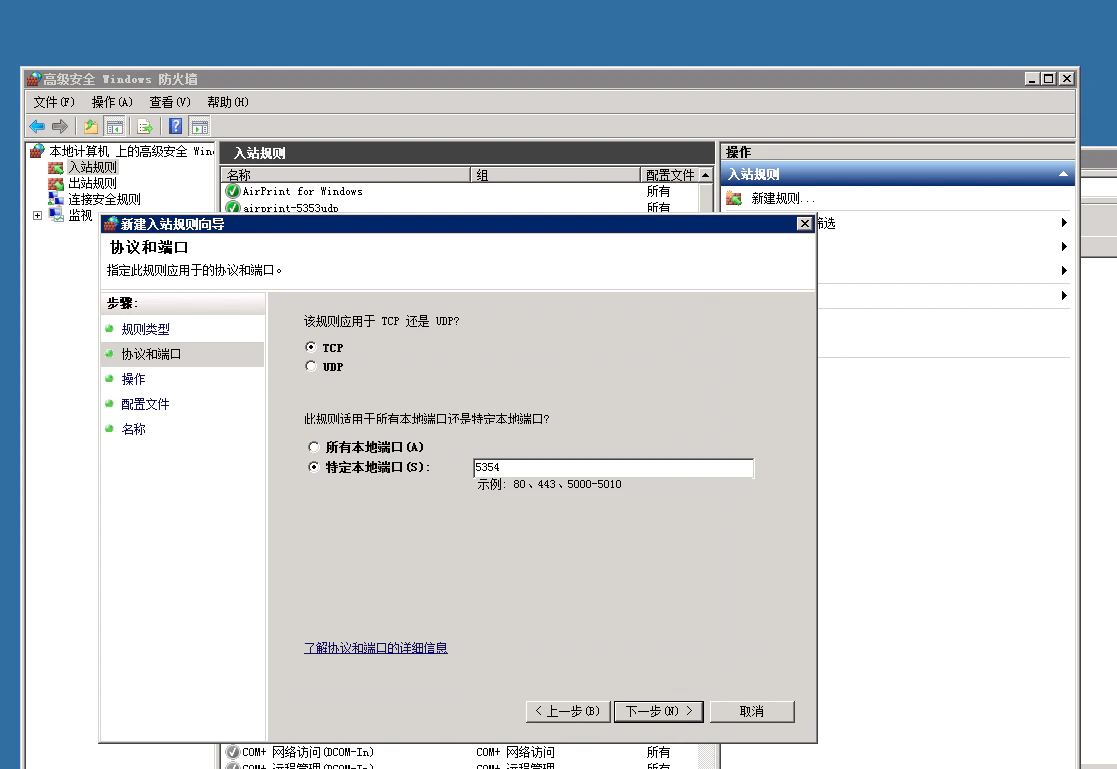 在弹出的「新建规则向导」中,首先在「规则类型」中选择端口,然后在下一步的「协议和端口」中选择 TCP,在特定的本地端口中输入「5354」;在下一步的「操作」中勾选「允许连接」,然后后面全部默认点击下一步,最后设置一个特定的名称即可完成。