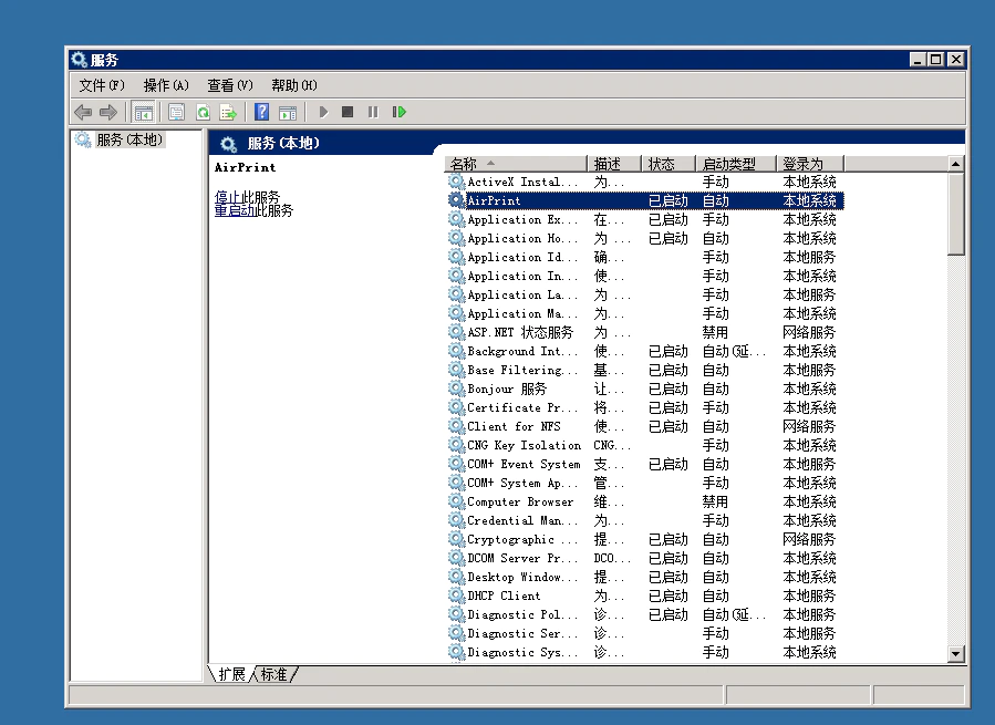 然后我们打开「控制面板 > 管理工具 > 服务」,检查 AirPrint 以及 Bonjour服务 两个服务是否已经处于启动状态。